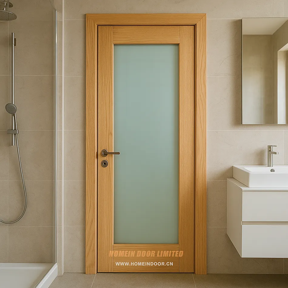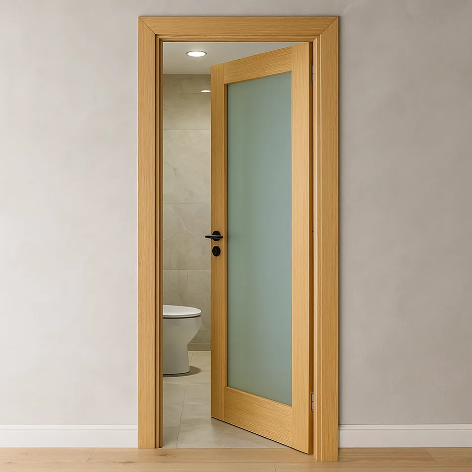 Pre:Interior bathroom rosewood wood door with half glass lite
