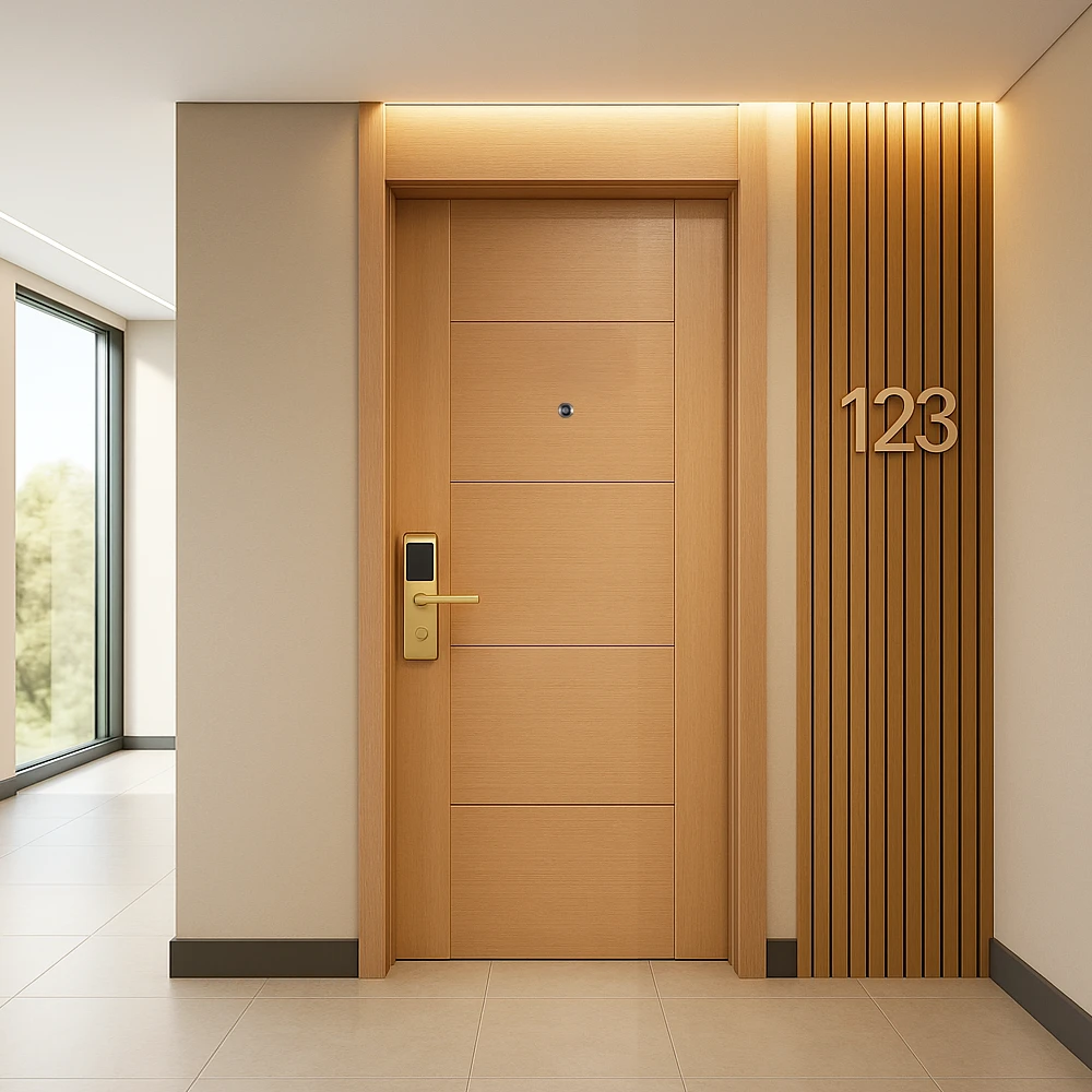Constructed with a solid hardwood frame and composite wood slabs, the door is built for durability and longevity. It also features high-quality smoke seals and acoustic seals to enhance both its fire protection and soundproofing performance. For added convenience, the door is designed to integrate with FRID smart locks, offering advanced security features and seamless guest access control.
