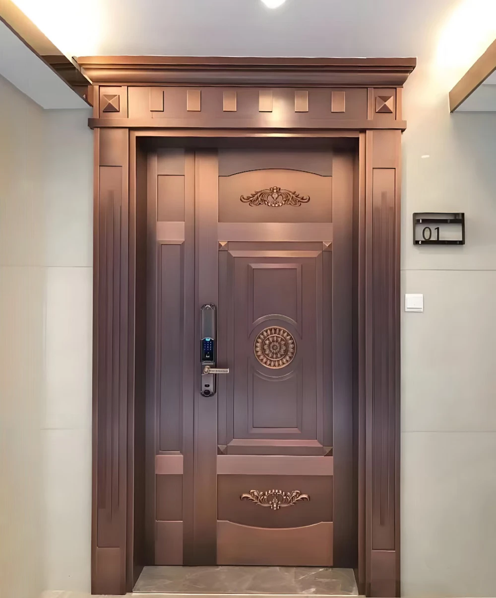 A brass security front door is a premium, high-quality door made from durable brass sheet panels used in both the door slabs and the frame. It is reinforced with an inner stiffener for added strength and stability, and can include optional cores like PU foam or lightweight honeycomb cores to improve insulation and structural integrity. This door also integrates advanced security features, such as a multi-point lock system and optional smart locks, providing a perfect blend of security, luxury, and functionality.