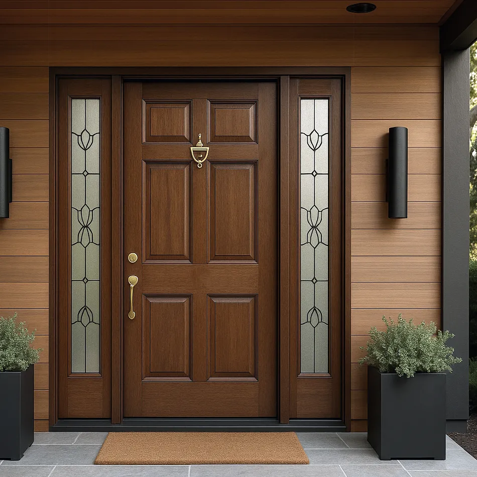 Next:villas exterior entry classic brown paint side-lite riased panel solid walnut wood door