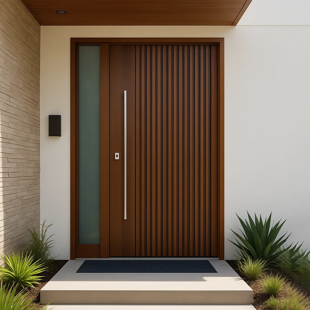 700 USDThe residential exterior mahogany fluted wood entry door with sidelite offers a sophisticated blend of natural beauty and modern design, ideal for enhancing any home's exterior. Made from solid mahogany, this door showcases the wood's rich, warm reddish-brown color and elegant grain patterns, which are not only visually striking but also highly durable. Known for its resilience to moisture and pests, mahogany is an excellent choice for outdoor use, ensuring that the door maintains its beauty and function over time.