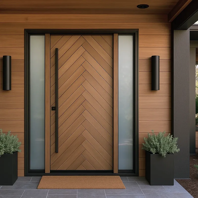The modern diagonal plank design adds a unique, contemporary touch to the traditional concept of entry doors. The sharp, angular lines create visual interest and depth, transforming your front entrance into a bold architectural statement. This design works especially well with a variety of home styles, from sleek modern to more rustic, making it a versatile choice for homeowners looking to elevate their appeal.
