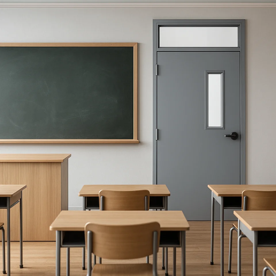 A classroom door with glass is a highly functional and durable solution designed for educational spaces that require bright environments and the ability to withstand high-frequency usage and impact. Typically, made from high-quality galvanized steel with a solid mineral core, this door is both strong and long-lasting, making it ideal for the demands of a school setting. The door's construction ensures it stands up to daily use and provides excellent performance over time, even in the most active school environments.