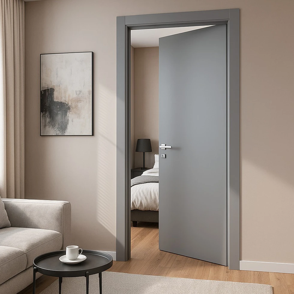 The Wood Flush Light Grey Interior Door offers a perfect blend of contemporary style and subtle elegance. Its soft light grey finish provides a calm, neutral backdrop that enhances modern interior spaces. The light grey interior door is incredibly versatile, effortlessly complementing various design schemes, from minimalist to industrial to transitional. The gentle hue brightens up any room, creating a fresh, airy atmosphere while maintaining a sophisticated aesthetic.