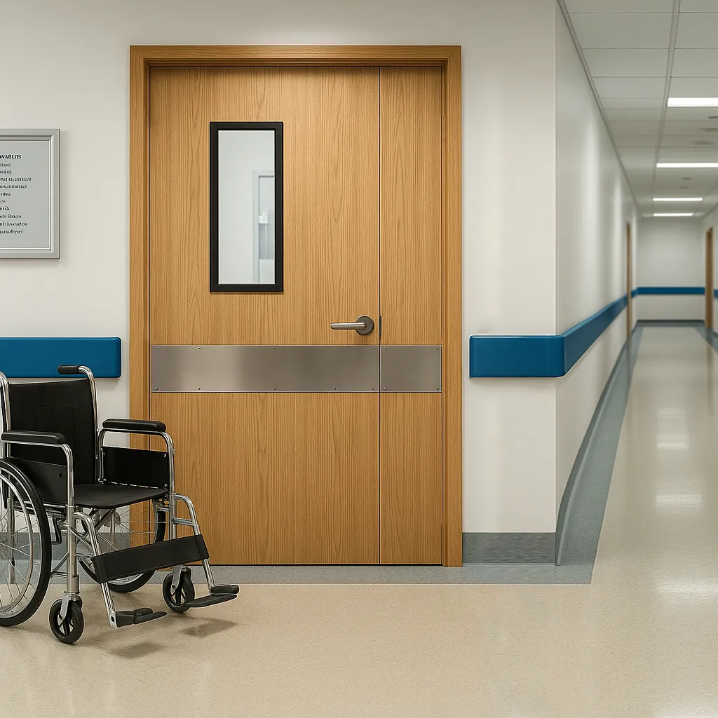 A key feature of this door is its vision panel, which allows doctors, nurses, and visitors to easily observe inside the patient room without disturbing the patient. The vision panel is designed to be flush with the door surface, eliminating any protruding frames that could collect dust, and it will also make cleaning much easy. The smooth, seamless design enhances hygiene, ensuring that the room remains easy to maintain. The clear glass vision panel also serves another purpose: it allows natural light to penetrate the room, brightening the environment and contributing to a more pleasant atmosphere for the patient.