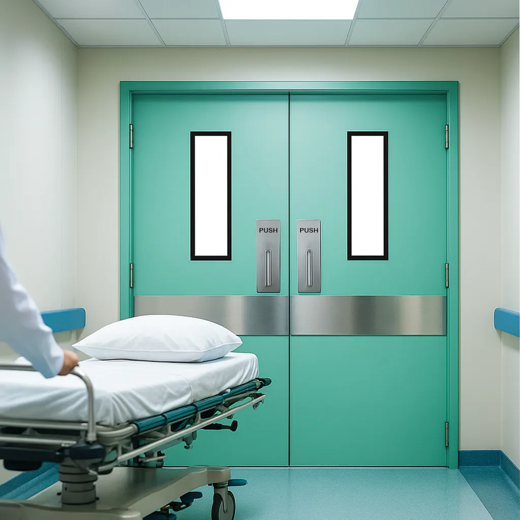 The double door configuration of this design creates a wider passage, allowing for an unobstructed flow of traffic. In a hospital corridor, where people and equipment must move quickly and efficiently, a wider opening helps minimize congestion and ensures that the flow of hospital beds, wheelchairs, medical carts, and people is smooth and unhindered. The double door setup is ideal for busy hallways where the volume of foot traffic and patient movement can be considerable throughout the day.
