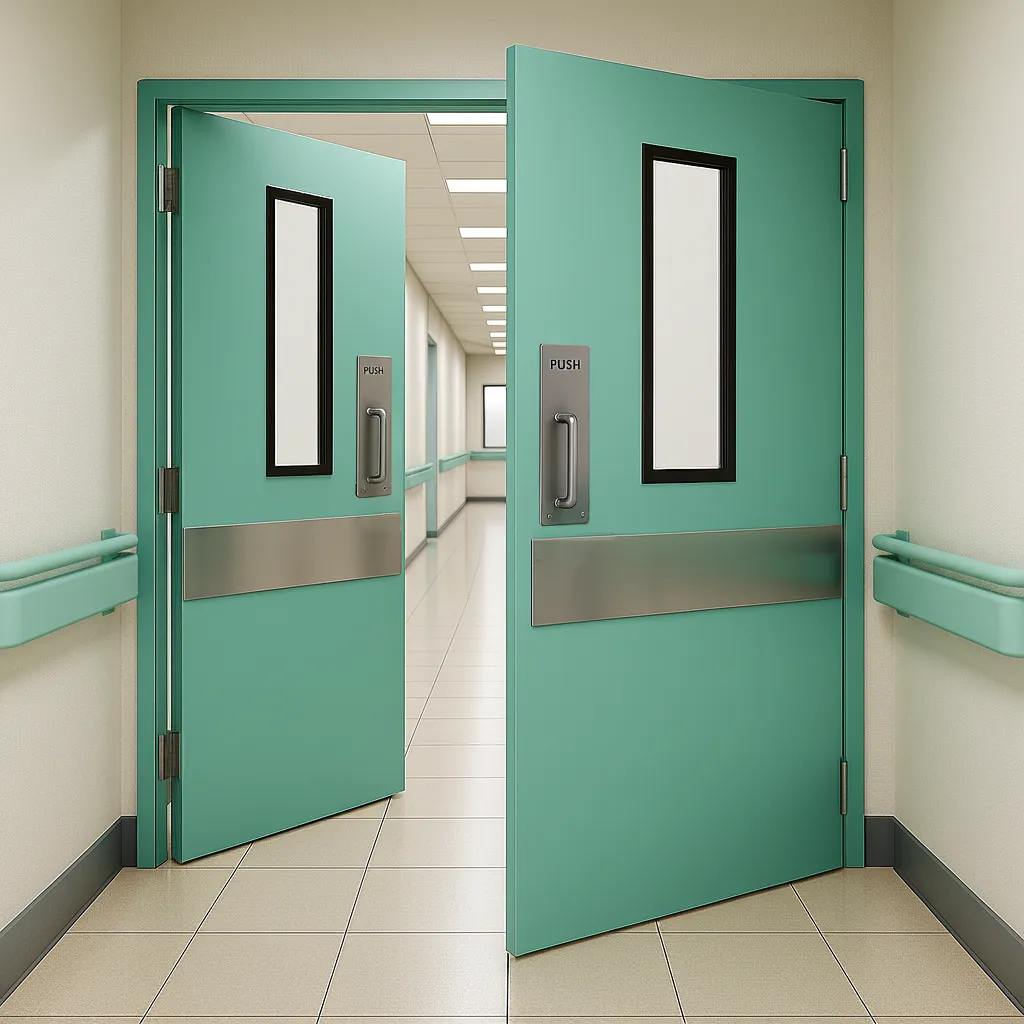 The Steel Hospital Corridor Double Swing Door is specifically designed to meet the demanding needs of busy healthcare environments, where there is constant movement of patients, nurses, doctors, hospital beds, and wheelchairs. This type of door is particularly suited for high-traffic hospital corridors, offering both practicality and durability for facilities that see heavy foot and equipment traffic on a daily basis.
