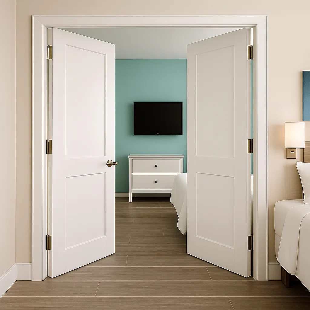 The bright white paint finish adds a fresh, airy feel to the bedroom, helping to create a clean and serene environment. The light color reflects natural light, making the space feel larger and more open. Whether you're aiming for a modern, neutral bedroom decor or prefer a more classic design, this door can easily blend with other elements of your room, such as furniture, wall colors, and flooring.