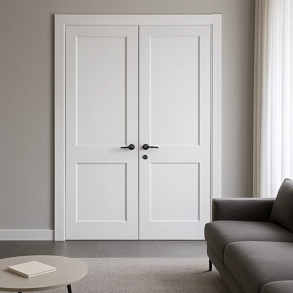 In summary, this White 2 Shaker Panel Wood Interior Master Bedroom Double Door is a perfect combination of style, strength, and eco-conscious design. Its clean lines and neutral color scheme make it adaptable to various design aesthetics, while its quality construction ensures long-lasting performance, making it an ideal choice for homeowners looking to elevate the look and functionality of their master bedroom.